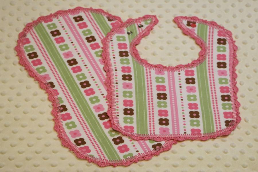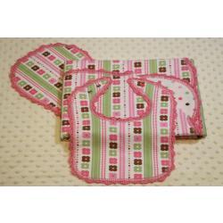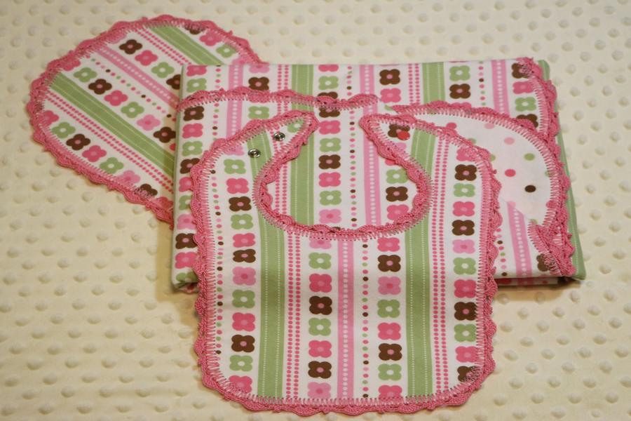 Scalloped Edge Flowers And Dots Hemstitched Flannel Blanket w/(2) Burp Cloths Kit